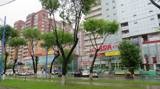 Wir fahren weiter nach Blagoveshchensk, der asiatischten Stadt Russlands, nur durch den Amur von Heihe in China getrennt, bei strömenden Regen gemachte Bilder vom Asia Hotel,