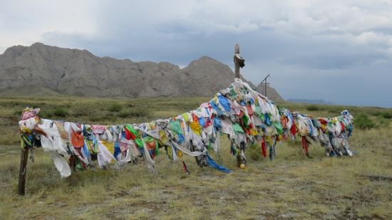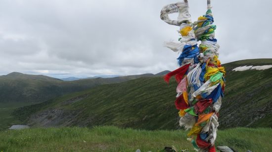 Der Mt. Khayyrakan mit seinen 1148m muss es dem Dalai Lama irgendwie angetan haben, als er ihn 1992 segnete, heute erinnern eine kleine Stupa und diese Gebetsfahnen an diesen denkwürdigen Tag.