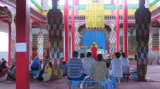 Ein Modell im Tempel zeugt von grossen Plänen, die man hier hat. Es ist bereits nach 17h, der Chef der Anlage hier mit seinen Adlaten beim Rückweg vom Tempel zum Kloster
