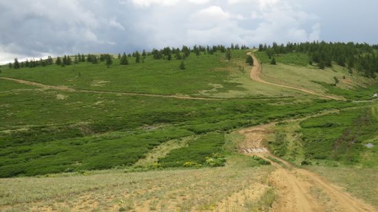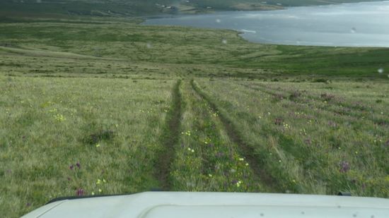 Gute 50km von den 180km sind schon geschafft, aber jetzt sieht der Weg so aus, gut 20 parallel verlaufende Spuren durch ein feuchtes, sumpfiges Wiesengelände