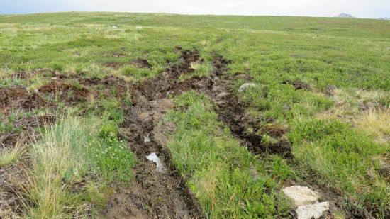 weisen uns (noch) den Weg. Die Piste verwandelt sich zu Fahrspuren im Grasland,