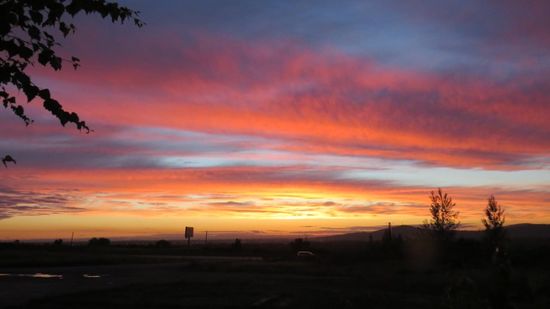 drunten im Tal kommt uns der Köllner ‚Lukimog‘ entgegen, hat vorne einen ‚schleichenden Platten‘, wohl wieder mal ein Schlauch ausgerieben und sucht verzweifelt nach der nächsten Ortschaft zum Reifenwechsel. Auf unsere enttäuschende Auskunft: ‚über die nächsten 70km kommt da nix‘ wird der Reifen gleich an Ort und Stelle gewechselt, SL3 dient gleich mal als Hebebühne bei der Demontage des 90 kg schweren Ersatzreifens, der da ganz droben am Aufbau hängt,… also so ganz durchdacht sind diese Expeditionskisten offensichtlich auch nicht,… Eine gute Stunde später, der Reifen ist gewechselt, unsere Wege trennen sich, wir fahren weiter Richtung Norden, suchen vergeblich nach einem vernünftigen Stellplatz und landen schliesslich bei bereits wohlbekannten Roadhouse nahe Abakan. Der Wirt freut sich uns wiederzusehen und dazu noch so ein Sonnenuntergang.