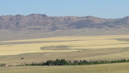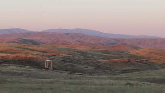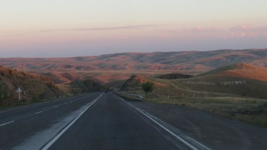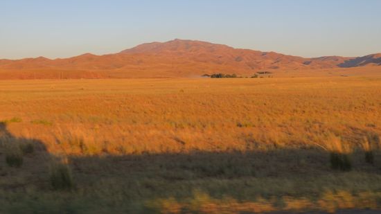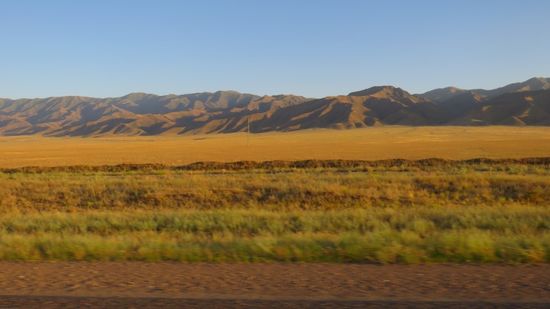 während wir mit SL3 im Feierabendbaustellenstau auf den gut 200km langen Weg zur Grenze nach Kirgistan aufbrechen. Hier dann, sobald das Weichbild der Stadt verlassen ist Steppe im Nachmittagslicht,