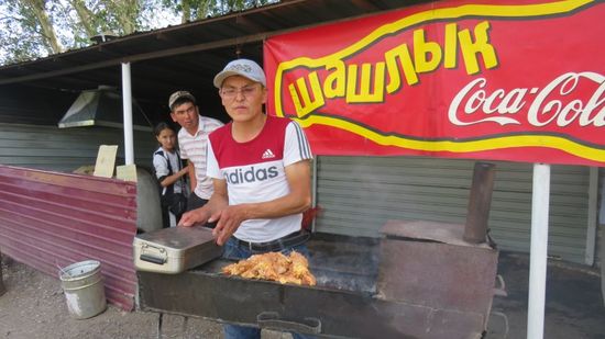 kurz darauf Mittagspause an diesem Schaschlik Stand, der Geflügelspiesse für TT350 und Lammspiesse für TT500 anbietet,