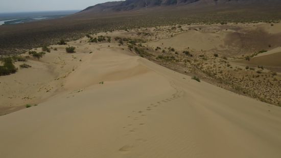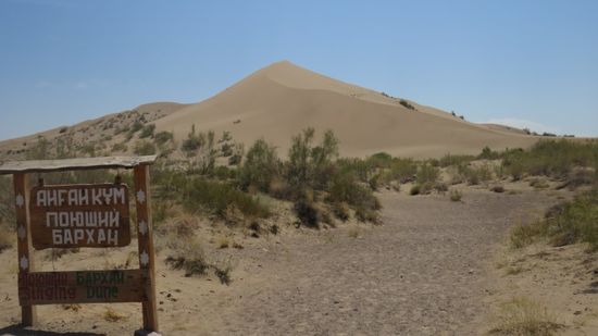 nach dem Maultrommelprinzip wirkt offensichtlich die gegenüberliegende Felswand wie ein Resonanzkörper für die über den Rand der Düne streichenden Winde. Noch ein kurzer Blick auf das Oshaktas Memorial