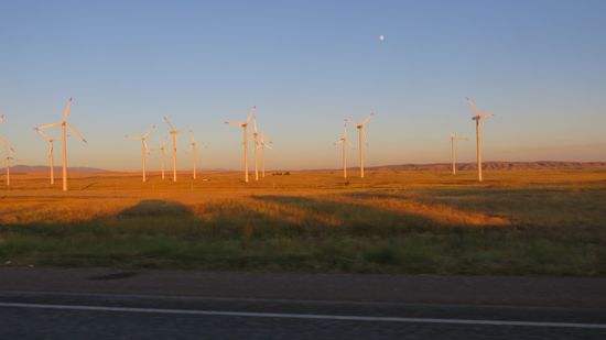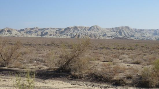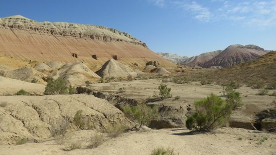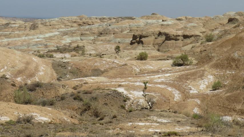 14:00, wir verlassen den Park, fahren Richtung Osten und durchqueren ein Gebiet, das von Farbe und Struktur uns doch sehr an die Badlands erinnert.