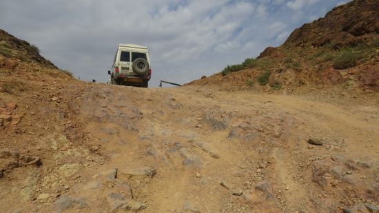Wir machen uns auf den Weg zum Aktay (= White Mountain) auf einer Staub-Sand-Geröll-Wellblech Piste,