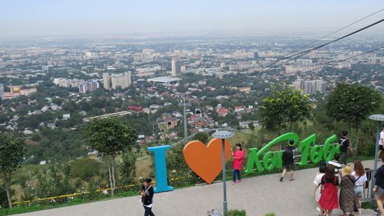 erreichen wir Almaty, früher Alma Ata genannt und bis 1997 auch Hauptstadt des Landes. Unser erster Weg dort geht hoch auf den Kok-Tobe Hill, garniert mit einem 372m hohen Fernsehturm,
