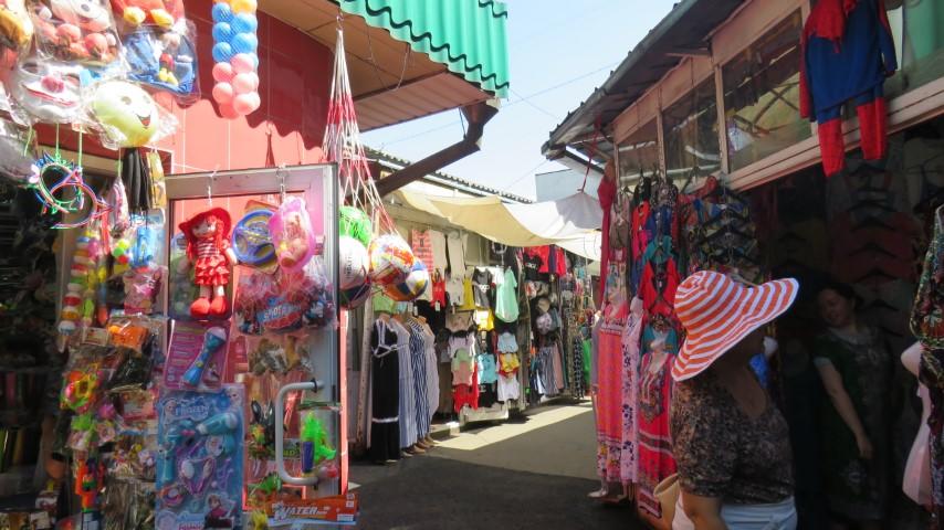 weiter zum Green Market, aussen grasgrün angestrichen, innen ein buntes Gemisch an Waren vom Plastikspielzeug