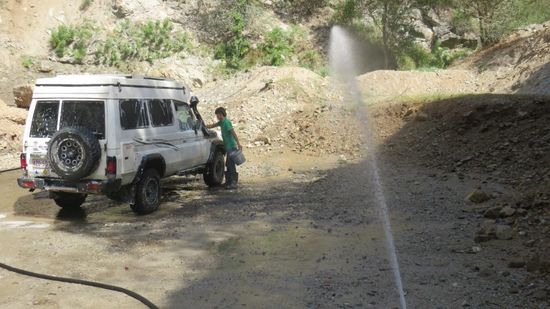 Junge Männer am Strassenrand bieten mit kräftig spritzenden Wasserschläuchen ihre Dienste als Autowaescher an, kennen wir ja schon aus der Türkei. Kurze Pause, für TJS 40 gönnen wir SL3 ein Schaumbad mit Unterbodenwäsche,