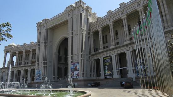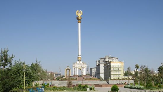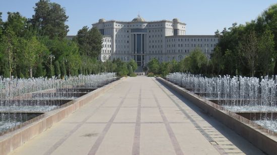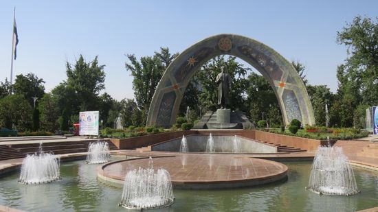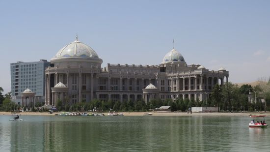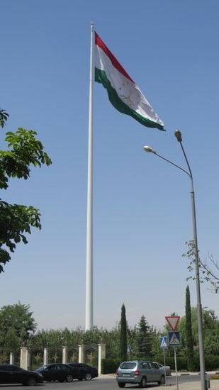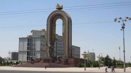 die Felgen und Reifen werden mit Bürste geschrubbt, das Solarpanel wird gereinigt und das ganze Auto noch abgeledert. Droben auf dem Berg wird die Strasse auch wieder besser, die letzten 100km bis Dushanbe eine ordentliche Teerstrecke. Mitten in der Stadt finden wir einen Parkplatz und brechen bei etwa 38º zur Stadtbesichtigung auf. Vorbei an der Statue von Ismail Somoni