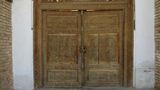 ihrer mit durch Schnitzereien reichverzierten Eingangstür.