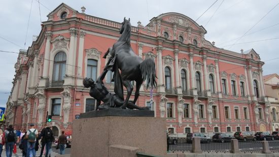 überqueren die Anichkov Most, wo die mit den Pferden ringenden Helden an den Kampf der Menschen mit der Natur erinnern sollen,