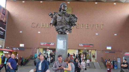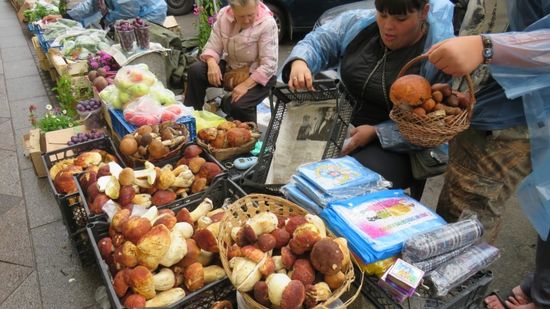 finden drinnen ein schönes Denkmal mit Peter dem Grossen, kommen an einer Markthalle vorbei vor der Frauen riesige Steinpilze verkaufen,