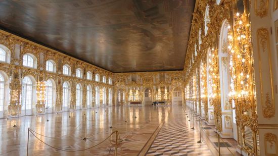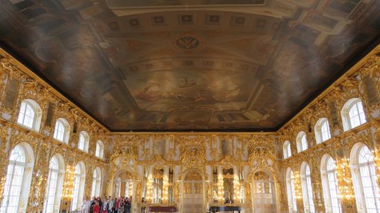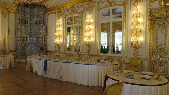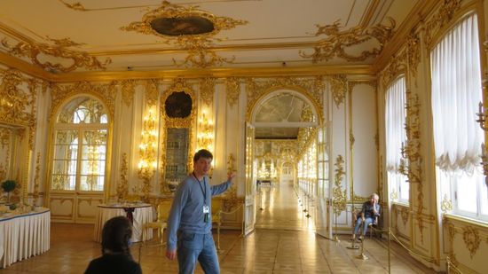 und dann an der Schlosskasse RUB 1.000 für die Palast Besichtigung, wobei von den angedrohten, befürchteten Warteschlangen für Individualtouristen absolut nichts zu sehen war. Wir müssen noch zur Schonung des Fussbodens solche OP-Saal Schuhbezüge überstreifen und werden, da der Palast nur Gruppenweise betreten werden darf, einer Gruppe russischer Individualtouristen und russ. sprechendem Führer zugeteilt, der viel und flüssig redet, wir davon aber leider kein Wort verstehen.