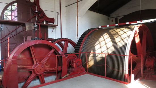 und nur durch Wasserkraft. Riesige Schaufellräder treiben diese Seilwinde an, mit der dann die Schiffe auf ihren Schlitten nach oben geschleppt, nach unten abgelassen werden.