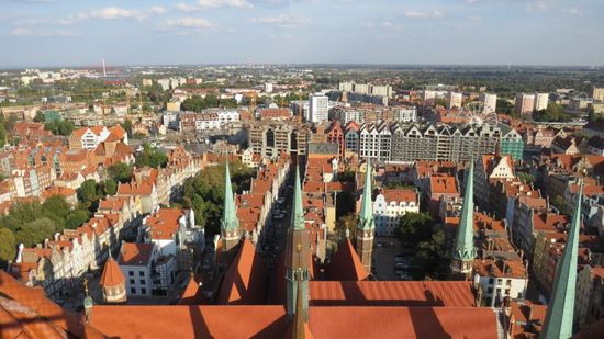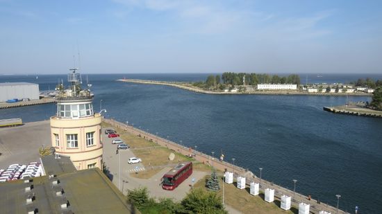 von dessen Spitze immer noch 4mal täglich eine Kugel abgesenkt wird, einst mit dem Zweck, den Kapitänen ein präzises Zeitsignal zu geben. Wir steigen hoch (E = PLN 10), kommen dabei so auch an jenem Fenster vorbei, von dem am 1.9.1939 die ersten Schüsse Richtung Westerplatte abgefeuert wurden.
