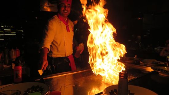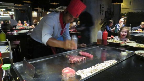 ein Bau im edlen Stalin Barock, mit einer Aussichtsplattform im 31. Stock (E=PLN 20), deren Besuch wir aber wetterbedingt ausfallen lassen und uns auf die Suche nach Nazyk Synagoge machen, deren Zugang sehr versteckt hinter einigen Neubauten liegt, die unter anderem ein Benihana beherbergen. Dieser uns vor allem aus den USA bekannten ‚japanischen‘ Restaurantkette können wir einfach nicht wiederstehen. Um eine heisse Herdplatte geschart und dann zu sehen, wie mit viel Show, Lärm und Feuer