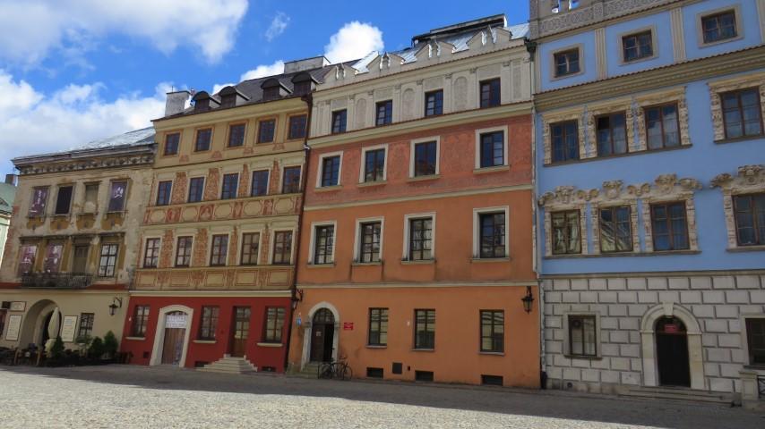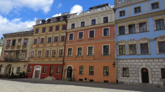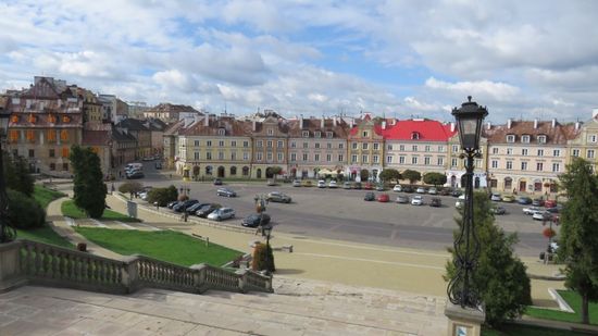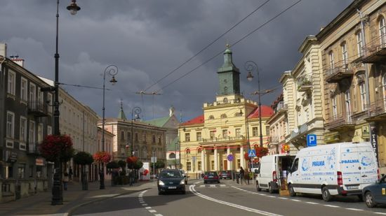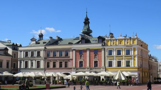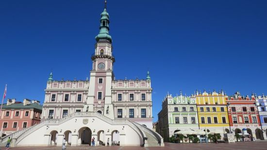 wurde praktisch von einem Architekten um 1580 eine ganze homogene Stadt entworfen. Im Zentrum der 100x100m grosse Rathausplatz Rynek Wielki, mit dem Rathaus,