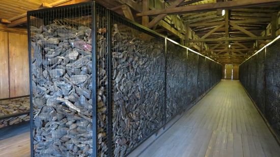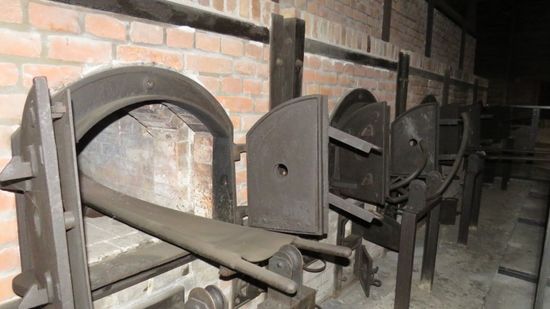 zum Krematorium, wobei unter diesem Mahnmal ein riesiger Aschehügel zu sehen ist