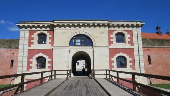per einer Brücke über den einstigen Burggraben durch das Stadttor