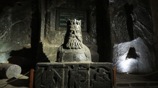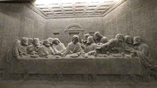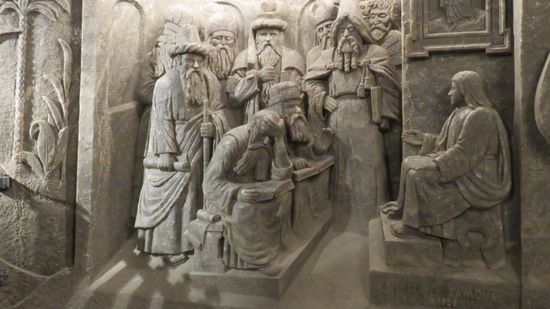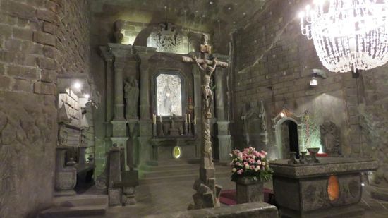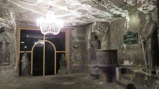 Weiter geht die Fahrt zum 15 km südlich von Krakow (Krakau) gelegenen Wieliczka Salzbergwerk, ebenfalls ein Weltkulturerbe. Hier wurde schon in der Steinzeit Salzlake gefunden, seit Urzeiten Salz abgebaut, erst vor ca. 20 Jahren wurde der Abbau nach Erreichen von Ebene 9 eingestellt. Heute ist dies nur noch ein Schaubergwerk, das bis Ebene 3 in 135m Tiefe im Rahmen einer bis zu 3-stündigen Führung besucht werden kann (E = PLN 89). Wir steigen erst 53 mal 7 Stufen hinab um Ebene 1 auf 64m zu erreichen, wandern nun durch Stollen und Schächte von Kaverne zu Kaverne, teils bis zu 60m hoch,