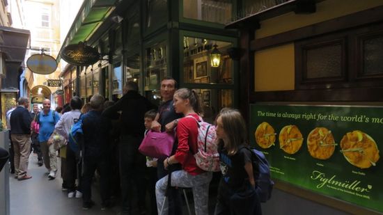 und uns am Stand vor der Oper zwei Karten für die heutige Vorstellung des Reinhard Fendrich Musicals ;I am from Austria‘ gekauft (4. Reihe, EUR 90 pP). Dann wollten wir eigentlich eine Mittagspause beim Figlmüller einlegen, der sich rühmt zumindest Österreichs größte Schnitzel zu servieren, Fladen, die bei einem 28cm Teller teils weit über den Rand ragen, aber bei diesen Warteschlangen vergeht uns der Appetit.
