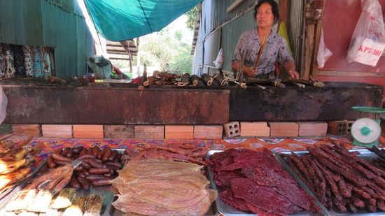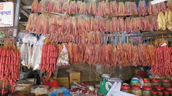durchqueren zum ersten Mal den Old Market, wo neben tausenden von nahezu identischen T-Shirts und Seidenkleidchen auch diese Luft-getrockneten Würste und Fische angeboten werden.