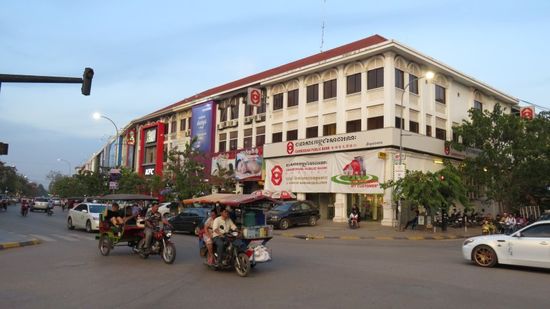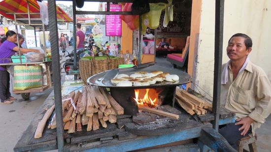 wo man noch das Flugzeug per Treppe verlässt, über die Rollbahn zum Terminal wandert, die ‚Gute Alte Zeit‘ hat uns eingeholt. Noch kurzes Anstehen um ein Einreisevisum ($30) in den Pass gestempelt zu bekommen, das Gepäck vom Band geholt, den Zöllnern zugewunken und schon nimmt uns unser zukünftiger Gastgeber Sok Phen (gleichzeitig Pensionswirt und TukTuk Fahrer) in der Eingangshalle in Empfang. Eigentlich hatten wir 5 Nächte bei ihm in seiner Pension Sok Phen Homestay gebucht, Angkor Wat nur 3km entfernt, mit dem Fahrrad erreichbar, aber draussen auf dem Land ist zur Zeit Stromsperre (=kein Licht, nur beschränkte Wasserversorgung,…), also bringt er uns für zwei Nächte ohne Zusatzkosten!! im sehr zentral gelegenen Amiral Hotel unter. Gute Lage, Swimming Pool, Klimaanlage, gut 80 Fernsehkanäle, ein Platz zum weiterempfehlen, wir können uns nicht beklagen. Ein kurzer Stadtbummel, ein erstes leckeres Abendessen, wir sind angekommen.