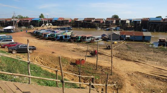 Bei Siem Reap gibt es 3 dieser sogenannten Floating Villages, schwimmende Ansiedlungen von ‚Haus-Booten‘ die gegen Gebühr besucht/besichtigt werden können. Wir wollen das lt. Internet abgelegenste, noch am wenigsten vom Tourismus verseuchte Kompang Khleang besichtigen und finden beim Morgen-Bummel durch Siem Reap einen Anbieter der uns mangels weiterer Kundschaft eine ‚private Tour‘ zum Gruppenpreis von US$37,-pP anbietet. Um 13:40 werden wir mit einem komfortablen Allrad-Fahrzeug (Lexus) vom Hotel abgeholt und zum Hafen dieser Ortschaft gebracht (1h).