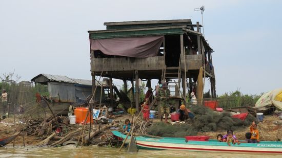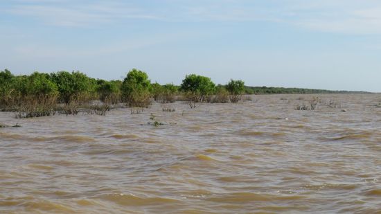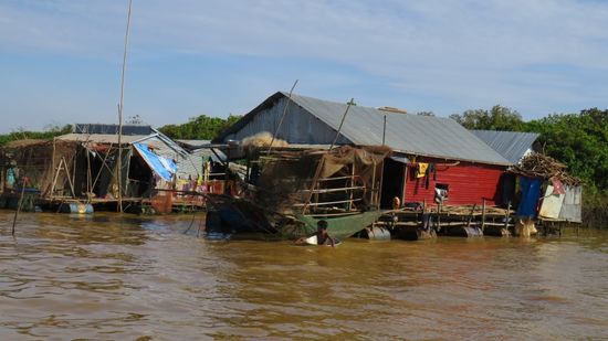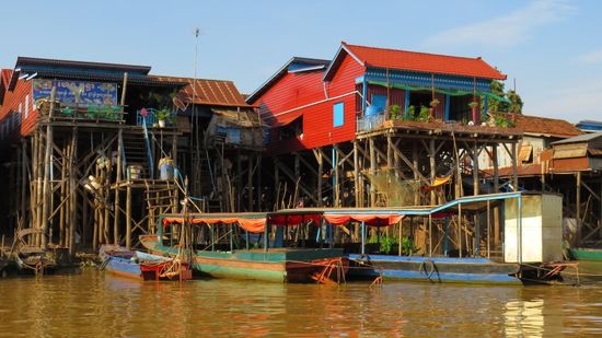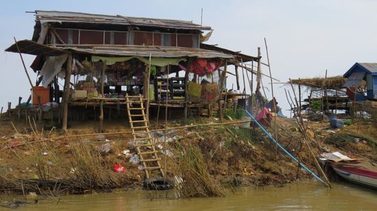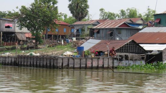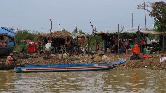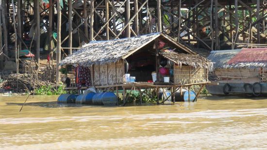 und fahren die nächsten 45min. auf einem Wasserarm raus bis zum Lake (See) Tonle Sap. Am Ufer solche Häuser auf Stelzen, die auf die nächste Regenzeit mit gut 5m höherem Wasserstand warten, im Fluss zahlreiche dieser Wassertaxis