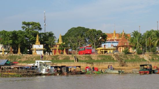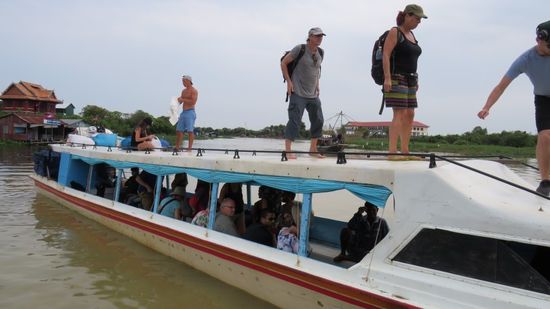 6:00 der Wecker klingelt, 6:55 der uns abholende Bus steht überpünktlich vor der Tür (7:00 war vereinbart) und bringt uns nach einer kleinen Stadtrundfahrt, bei der weitere 25 Gäste eingesammelt werden zum Hafen von Siem Reap, denn heute wollen wir mit dem Linienboot nach Battambang fahren. Um 08:30 ist das Laden von Passagieren, Gepäck und Fracht beendet, wir legen ab,