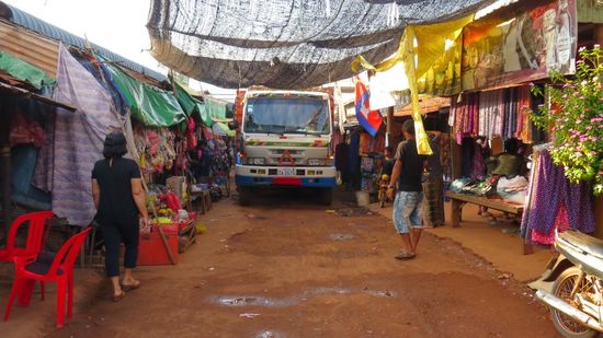 geht es über den Markt, an dem anscheinend gerade eine größere Lieferung eintrifft.