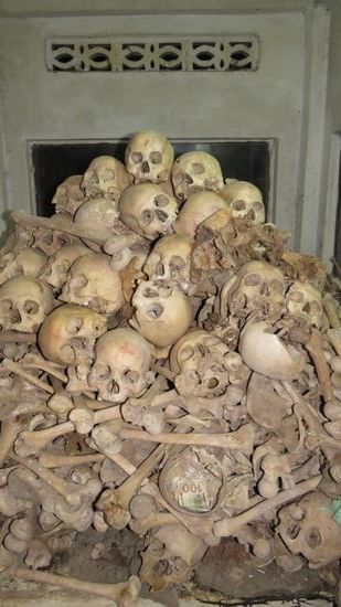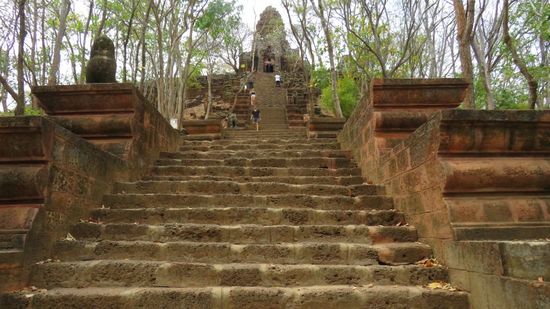 Die Fahrt, ja, kann man machen, muss aber zumindest derzeit nicht sein, denn weder am Start – noch am Zielpunkt irgendwelche Infrastruktur, eigentlich ausser ein paar Obstbäumen und Reisfelder nichts zu sehen. Aber für den, der es liebt auf dem Rummelplatz mit der ‚Flotten Maus‘ zu fahren ein absolutes Muss. Unsere Fahrt geht weiter zum Phnom Sampeou, wo man entweder wie wir die 200Hm hoch wandern kann, sich für ($2H/R) einem Mopedfahrer oder für $4 einem Jeep anvertraut. Droben neben den Tempeln ein Andenken an die schwarzen Tage unter den Khmer Rouge, die Killing Cave,