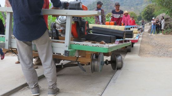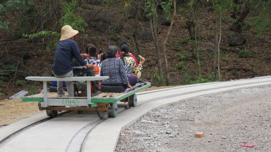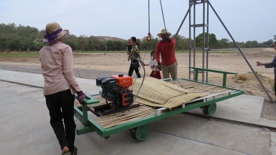 Dann die!! Touristenattraktion hier, der Bamboo Train ($5pP). Ein paar Bambusbretter über Mini Rädern, am Heck von einem kleinen ca. 6PS Motor angetrieben, früher mal ein Beförderungsmittel für die Landbevölkerung um Waren zum Markt in der Stadt zu transportieren, dann wurde für Touristen die Originalstrecke durch die Wildnis überarbeitet, aber der Startpunkt war zu abgelegen für den Massentransport. So hat man hier vor ein paar Monaten am Banan Temple eine ganz neue Strecke angelegt, neue Fahrzeuge bereitgestellt, die Piste betoniert,