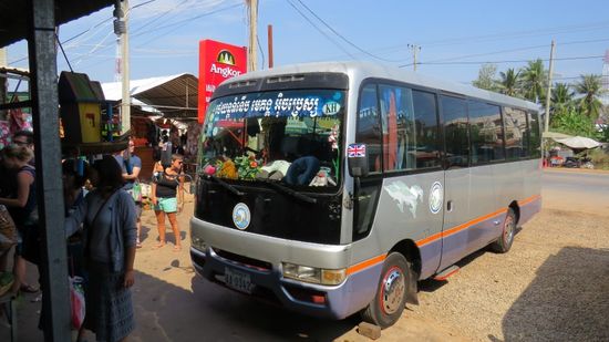 Am letzten Morgen hier in Battambang werden wir um 7:45 mit dem Bus am Hotel abgeholt, weitere Fahrgäste werden noch eingesammelt und dann kehren wir mit dem ‚Mekong Bus‘ ($7, 3Std.) zurück nach Siem Reap.
