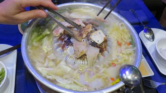 eine tolle Kombination, denn das Gemüse und die Nudeln werden in Brühe gegart, kommen in einen chinesisch/mongolischen Hot-Pot (hier oft auch Steam Boat genannt) während man das Fleisch auf einem koreanischen Barbecue (so eine Art Tischgrill) sich selbst zubereiten darf.