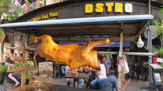 wandern den knappen km zum Hotel und brechen dann gleich mal zur ersten Stadtbesichtigung, zur Suche nach einem standesgemäßen Abendessen auf. Heute am 25. ist einer unserer privaten Fest-und Feiertage, dieses Schwein grinst uns zwar an, aber die 2-3 Stunden bis sein Garpunkt erreicht ist wollen wir doch nicht mehr warten