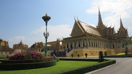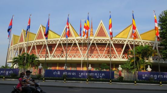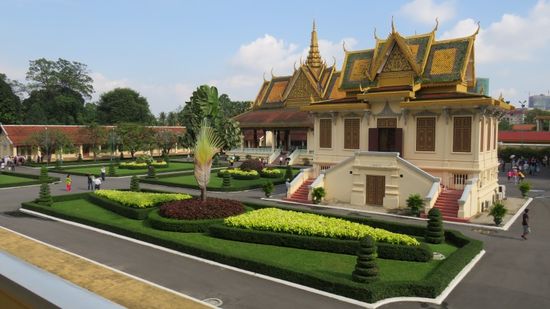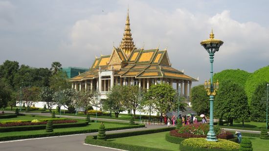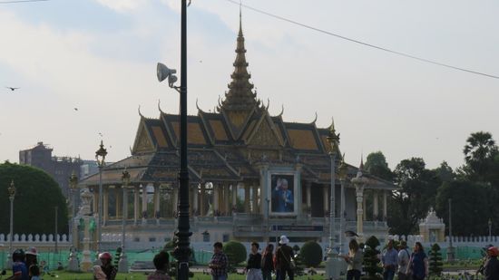 und erwerben dann, diesmal züchtig bekleidet die Tickets zum Besuch des Royal Palace. Auch hier wieder einmal ein leuchtendes Beispiel des Touristen-Melken. Üblicherweise wird hier im Land in US$ mit einem Kurs von 1:4000 abgerechnet, aber hier wird der Eintrittspreis mit Riel 40.000 angegeben – und da der offizielle Wechselkurs mittlerweile bei etwa 1:4010 liegt, werden natürlich $10 + 1000 Riels verlangt, denn Kleinvieh macht auch Mist und bei allein ca. 1.000 chinesischen Besuchern pro Tag eine stolzes Zubrot. An der Main Conference Hall vorbei,