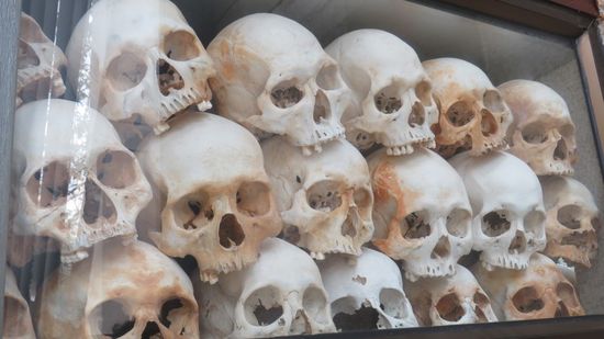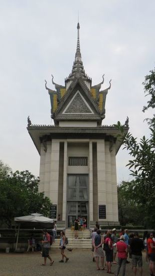 Der heutige Tag ist der dunklen Vergangenheit Kambodschas gewidmet. Unter dem Regime der Roten Khmer wurden zwischen 1975 und 1979 ca. 3 Mio. Kambodschaner (=mehr als ¼ der Bevölkerung) auf sogenannten Killing Fields systematisch ermordet, in Massengräbern verscharrt. Wir haben uns wieder einmal ein TukTuk gemietet ($20 / Tag) und lassen uns erst einmal nach Cheong Ek, dem Killing Field von Phnom Penh bringen (E=$6pP incl. Audio Guide), wo die Überreste von ca. 30.000 Männer, Frauen, Kindern, Säuglingen aus solchen Gruben geborgen wurden.