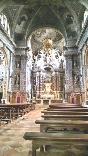 Durch die Verwendung von polychromen Marmor und reichen Figurenschmuck wird das Licht der seitlichen Thermenfenster gedämpft. Der opulente Hauptaltar trennt das Presbyterium vom Mönchschor. Mehr als 60 Grabplatten in weißen oder roten Marmor befinden sich auf dem Fußboden.