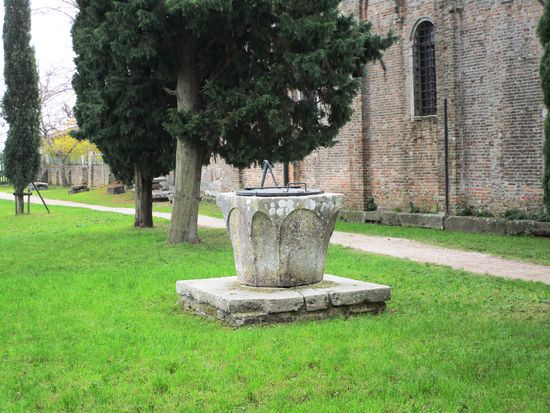 Über eine Brücke gelangen wir zum Fondamente dei Borgognoni, kommen an einigen Verkaufsbuden vorbei und sehen dann neben der Basilika die Taufkirche Chiesa Santa Fosca, ein Rundbau um 1100, die mit ihren Säulenvorhallen byzantinische Eleganz bezeugt. Im Innern beeindrucken die Holzteile der Kuppelkonstruktion sowie die verlängerte Apsis. Die Kirche hat geöffnet, wir können sie anschauen und einige Bilder machen.