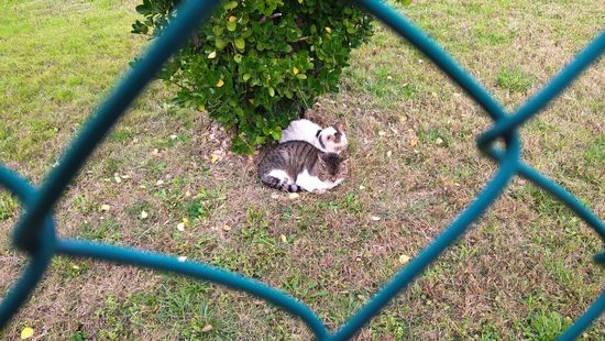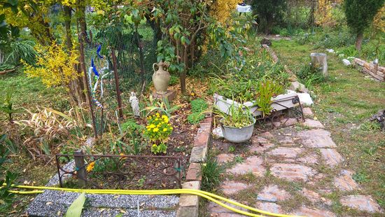 Wir sehen schöne Gärten, in denen es sich einige Katzen gemütlich gemacht haben.