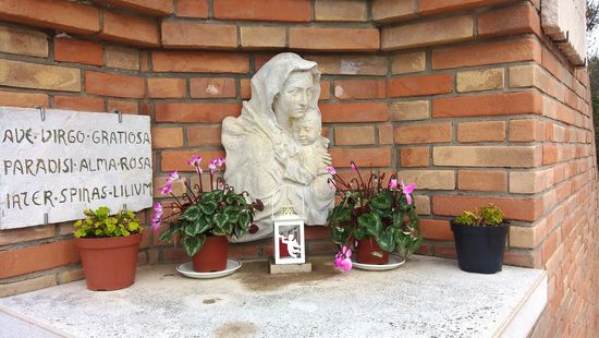 Ein Schild informiert darüber, dass das Haus 2004 der Nostra Signora Regina di Fatima geweiht wurde.