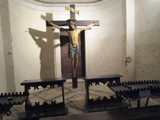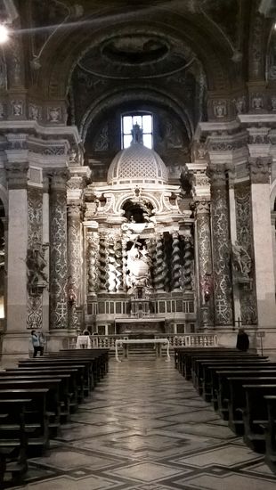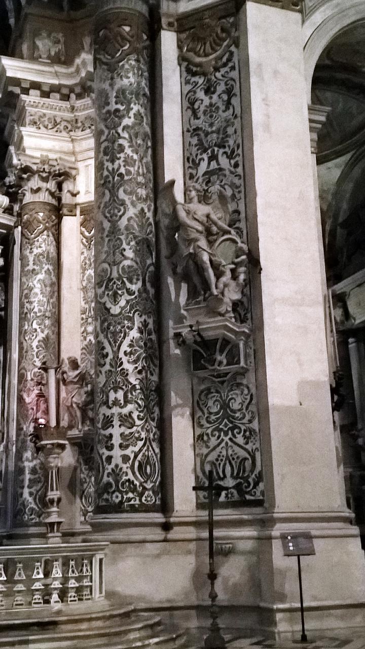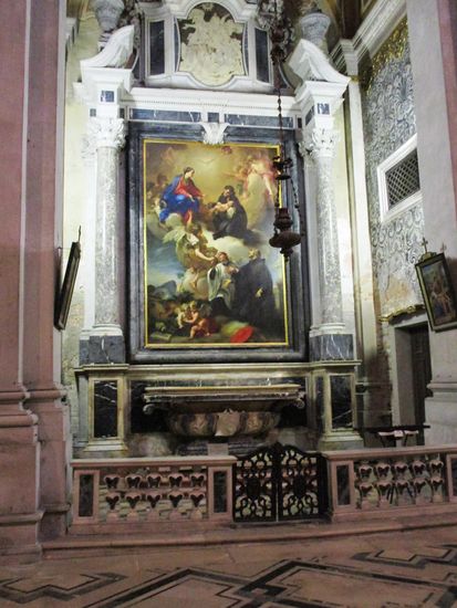 Die Fresken der überwiegend goldenen Stuckdecke stammen von Louis Dorigny und Francesco Fontebasso. Giuseppe Pozzo, Bruder des berühmten Andrea Pozzo, schuf den Altar mit zehn gedrehten Säulen, die dem Altarziborium des Petersdoms in Rom nachempfunden sind. Die Wände sind mit weißem und grünem Marmor verkleidet und auch der Fußboden hat kostbare Inkrustationen in den gleichen Farben. Nach Süden schließt sich das ehemalige Konventgebäude an.