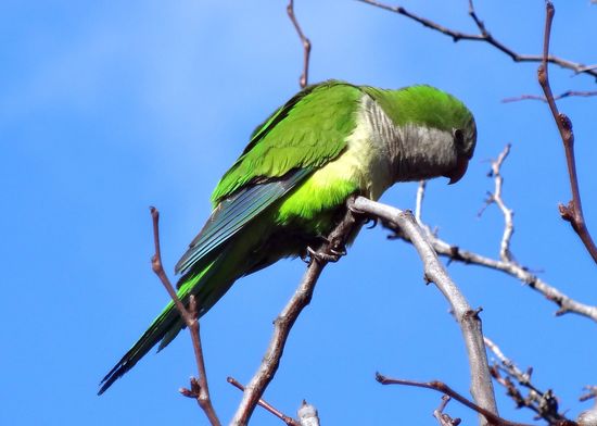 Mönchspapageien, ursprünglich in Südamerika beheimatet, fliegen hier in kleinen Schwärmen herum, machen Krach wie Spatzen, ist die einzige Papageienart, die ihre Nester aus Zweigen baut, wie z.B. hier in Palmkronen
