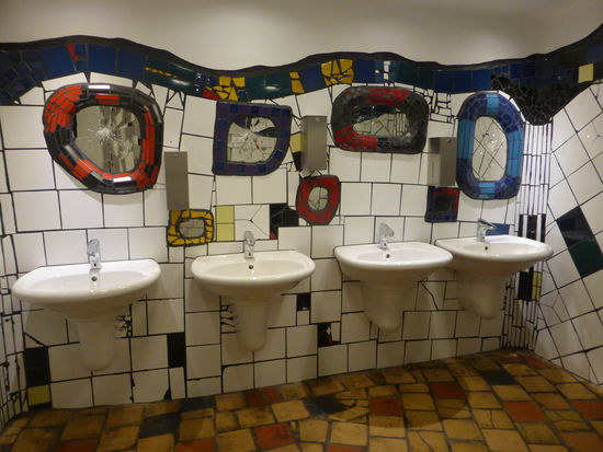 Direkt gegenüber liegt das Hundertwasser-Village, eine Ansammlung kleiner kommerzieller Läden, errichtet im passenden Stil mit entsprechender Toilette.