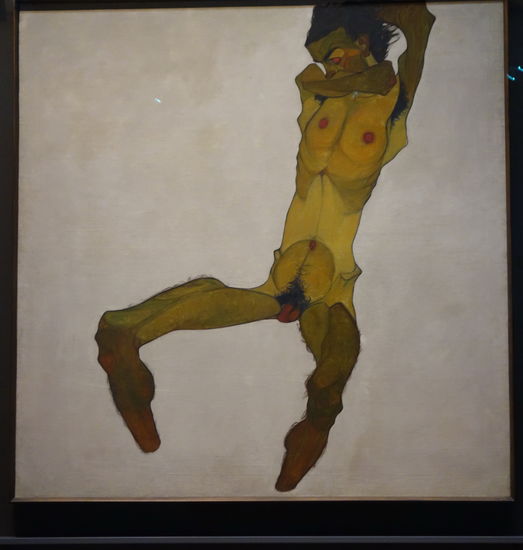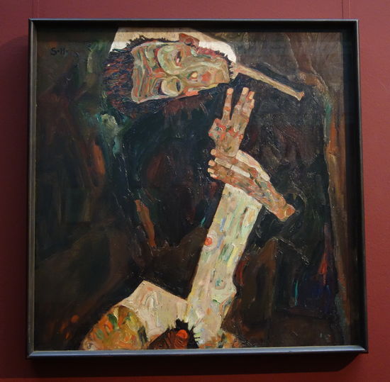 Trotz seines frühen Todes mit 28 Jahren schuf Schiele ein Werk mit distinkten Schaffensperioden und weltanschaulichen Entwürfen. Erst zwanzig-jährig kreiert er einen radikalen Expressionismus mit extremen Körpergesten bald danach Seelenbilder mit symbolistisch-rnystischen Inhalten. Nach der Zäsur eines traumatischen Gefängnisaufenthalts zeigen sich die Kompositionen ruhiger und kontextreicher. Der Erste Weltkrieg machte das Arbeiten schwierig. Schiele wird in seinen letzten Lebensjahren realistischer. Volumina kehren in die Bildgestaltung zurück, der Blick wendet sich nach außen. Mitten im Werden einer neu-sachlichen Malerei stirbt der Maler - nur Tage nach seiner –damals schwangeren - Frau im Spätherbst 1918. Museumstext