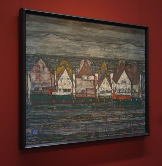 Ein wichtiges Thema im Werk Egon Schieles bilden Häuser- und Stadtansichten. Ein Großteil dieser Bilder verweist auf ein- und dieselbe Stadt, nämlich Krumau in Südböhmen (heute: Cesky Krumlov/ Tschechische Republik). Schiele faszinierten vor allem die engen, verwinkelten Gassen mit den alten, morbid wirkenden Fassaden und Dächern. Vom hoch gelegenen Schlossberg aus fand er Gelegenheit, die schmalen Straßenzüge von oben darzustellen, so etwa in der Ansicht »>Die Kleine Stadt< II« von 1913. Mittels geringfügiger Manipulationen wird die reale Topografie verändert und erhält durch die menschenleere Szenerie eine magische, traumhafte Stimmung: Im Gemälde »Die Häuser am Meer (>Häuserreihe<« von 1914, worin Schiele eine Krumauer Häuserzeile in eine öde, flache Uferlandschaft versetzt, erreicht diese melancholische Stimmung einen Höhepunkt. Zugleich widmet sich Schiele minutiös detailreichen Beschreibung einzelner Motive, etwa in der liebevollen Schilderung der Dachschindel im Bild »Haus mit Schindeldach (>Altes Haus< II)« von 1915. Die an der Leine hängenden Wäschestücke vor dem Haus verraten in diesem Bild auch deutlich die Spuren der Bewohner des Hauses. - Museumstext