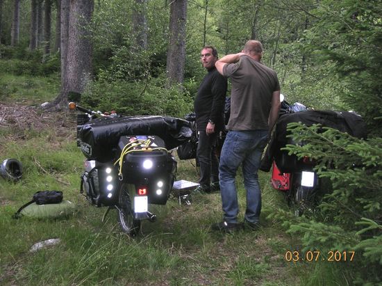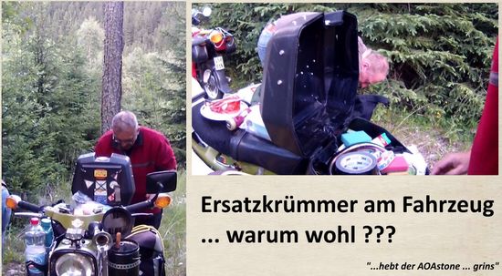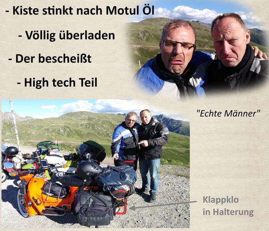 ... Dabei fällt mir doch eine Modifikationsidee für die Tour im nächsten Jahr ein. ... sowas wie Landeklappen oder einen Bremsfallschirm für lange Abfahrten. Mal überlegen... Sieht scheiße aus (1. Pluspunkt), wäre aber gut für den Motor (2. Pluspunkt), meine Jungs würden den Kopf "unfassbar, der wieder" schütteln (3.Pluspunkt) ... schauen wir mal was 2018 kommt!